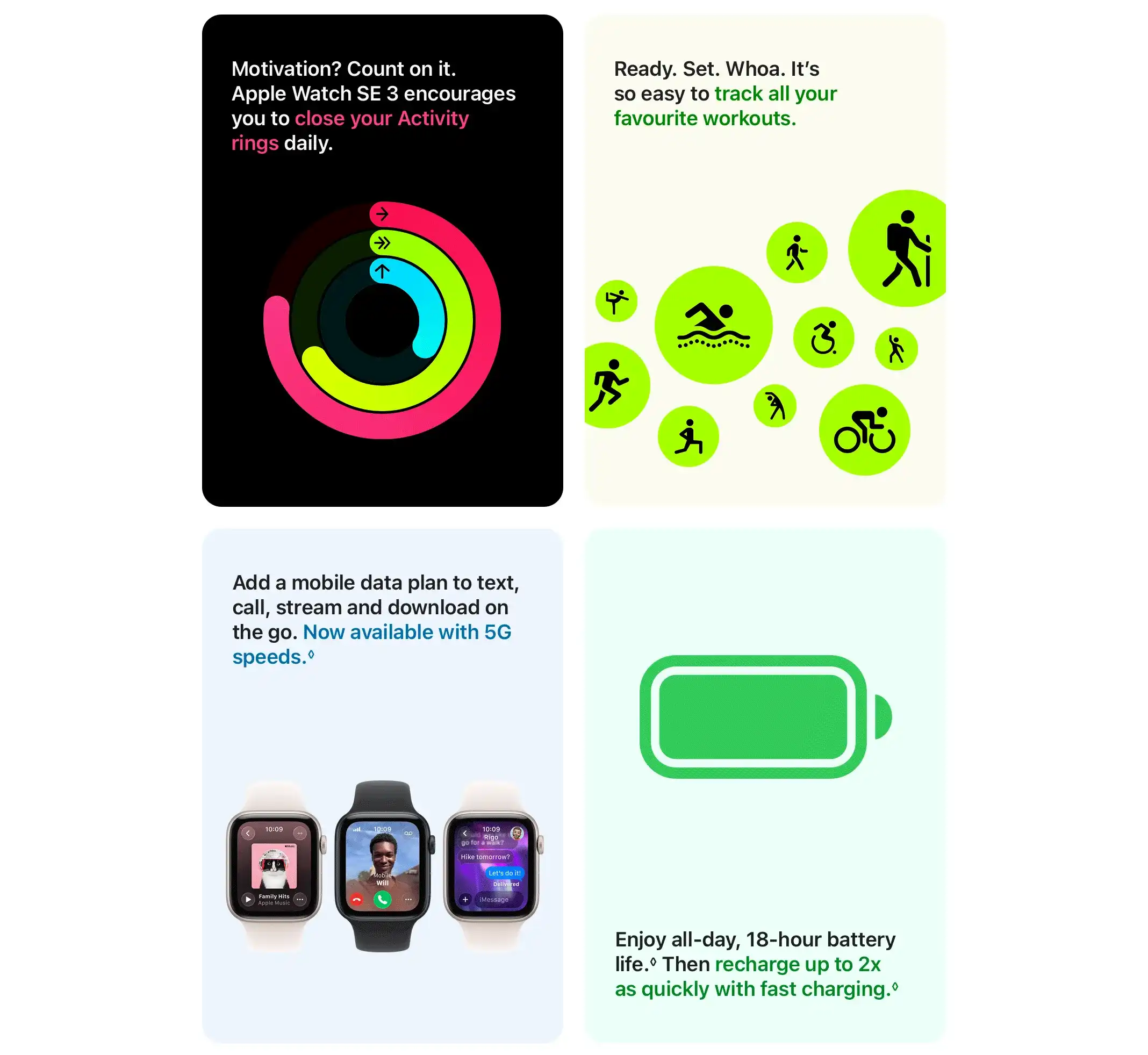 The power-efficient S10 chip allows the Apple Watch SE 3 to deliver reliable all-day, 18-hour battery life, ensuring it’s ready from your morning run to tracking your sleep. And for the first time on SE, you get new fast charging, which is up to 2x faster than before. Need a quick boost? A short 15-minute charge delivers enough power for up to 8 hours of normal use—perfect for a fast top-up before heading out the door.