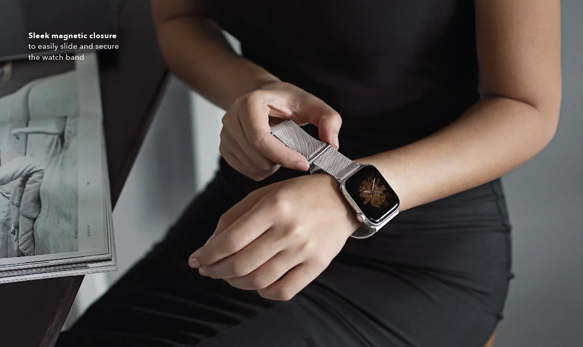 Complete the look with Dante, an Apple Watch Milanese Loop strap made of quality 316 Stainless Steel. Its irresistible mesh design wraps exquisitely around your wrist, providing breathable comfort that is slightly cool to touch. Completed with a sleek magnetic clasp to secure easily for the perfect fit. Compatible with Apple Watch Series 7 | 6 | SE | 5 | 4 | 3.
