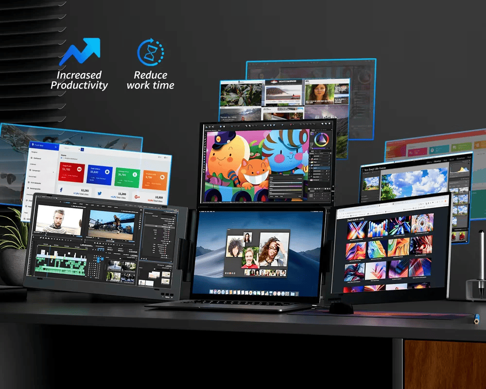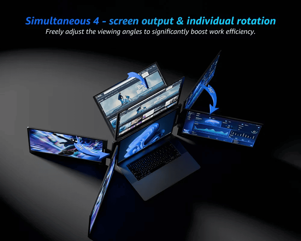 Experience the power of a simultaneous 4-screen output with the V2Com W3. This setup allows for individual 360° rotation of each additional 15.6” panel, giving you the freedom to adjust viewing angles independently. By tailoring your visual field to your exact needs, you can significantly boost work efficiency and create a truly immersive, personalized workstation.