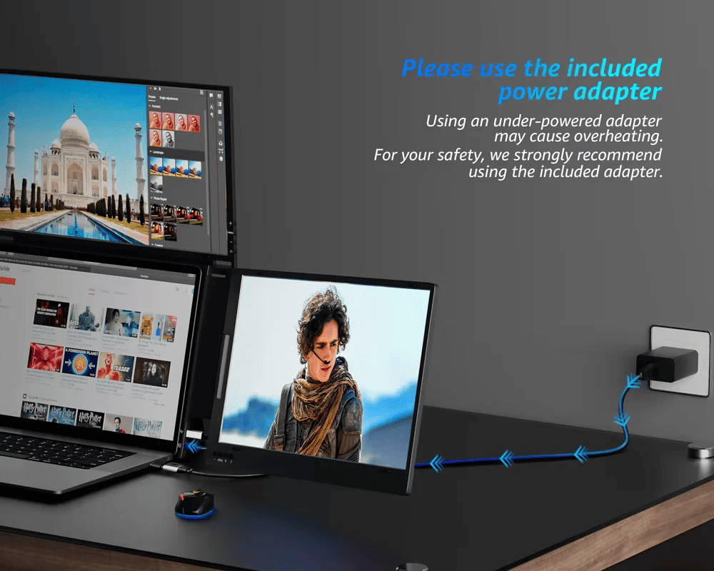 To ensure safe and stable operation, the V2Com W3 is designed to work with its dedicated power adapter. Using the included high-capacity charger prevents overheating and ensures that all four screens maintain consistent brightness and performance. This reliable power delivery system provides peace of mind while you push your multitasking limits.