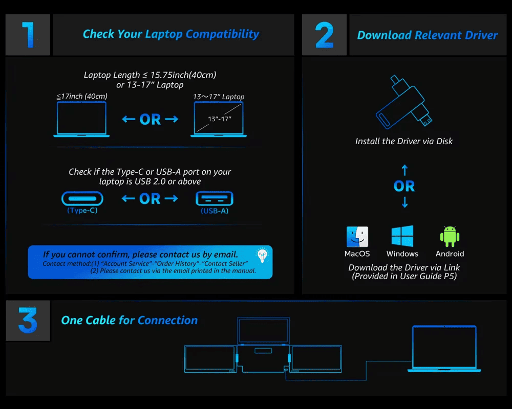 Get up and running in minutes with our simple 3-step setup. First, ensure your 13”-17” laptop has a USB 2.0 or higher port (Type-C or USB-A). Second, install the required drivers for macOS, Windows, or Android via the included disk or online link. Finally, enjoy the simplicity of a single-cable connection to power your entire quad-screen experience.