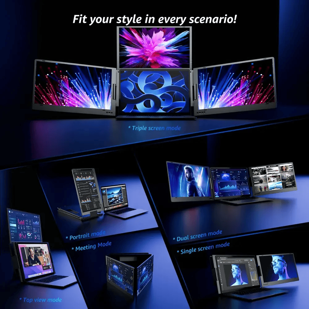 Tailor your visual experience with the V2Com W3's extreme flexibility. Each of the three external screens—left, right, and upper—features a 360° rotation range, allowing you to flip, tilt, and angle your displays to the perfect position. Whether you're sharing your screen with a colleague across the table or finding the most ergonomic setup for your desk, these adjustable hinges provide total viewing freedom.