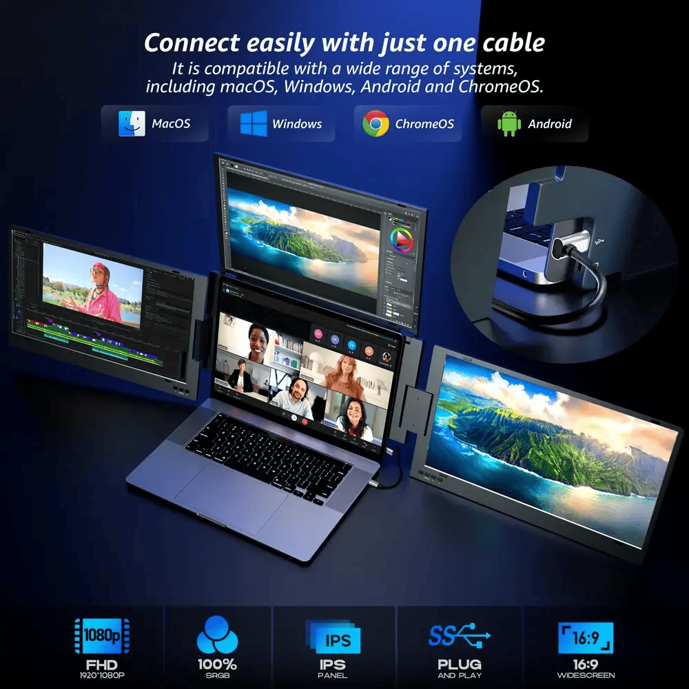 Elevate your laptop into a full-scale workstation with the V2Com W3 15.6” Quad Monitor. This portable powerhouse adds three FHD IPS screens to your setup with a single-cable connection, offering 85% sRGB color gamut and adjustable brightness. Perfect for professionals on the move, it combines a sleek 16:9 widescreen aesthetic with a lightweight, foldable design for ultimate portability.