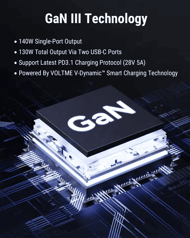 Experience the best of fast charging with support for Power Delivery 3.1 (PD3.1) and Quick Charge (QC) technologies. Revo 140 is designed to provide fast and reliable power for a variety of devices, ensuring maximum charging efficiency.