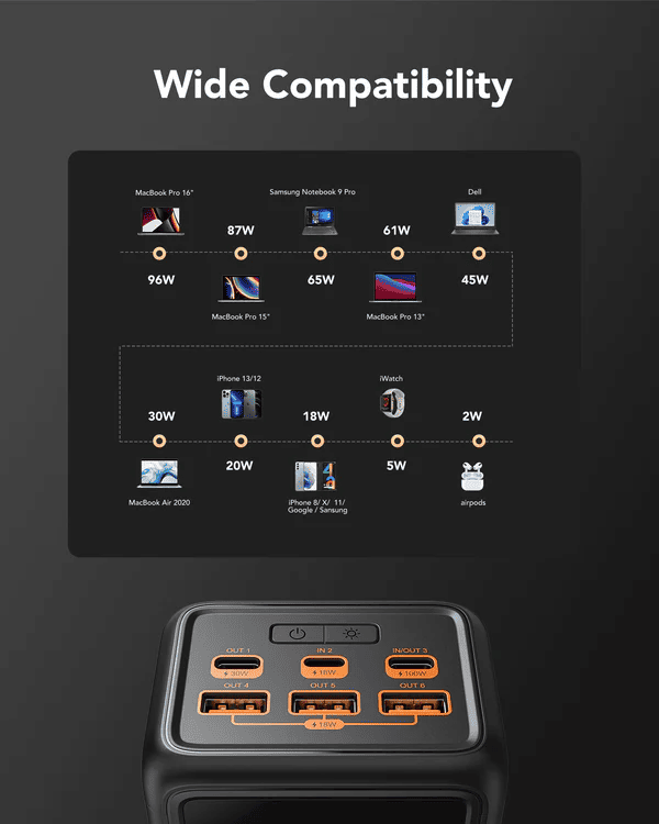 Equipped with 2 PD Type-C ports (100W + 30W), which can provide enough power to simultaneously fast charge a 16'' MacBook Pro and an iPad Pro at full speed. The Type-C input/output also supports 60W fast recharging.