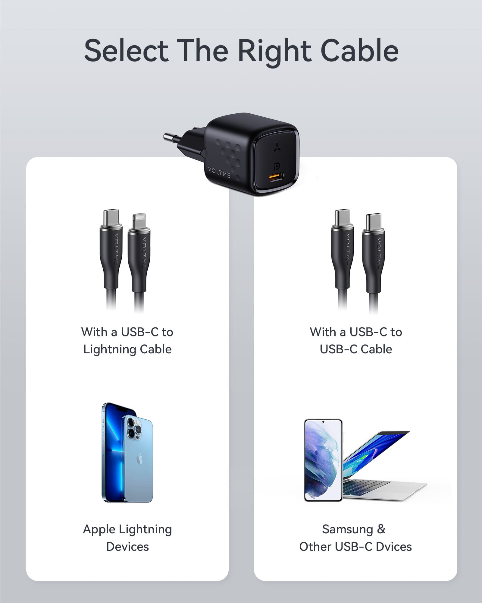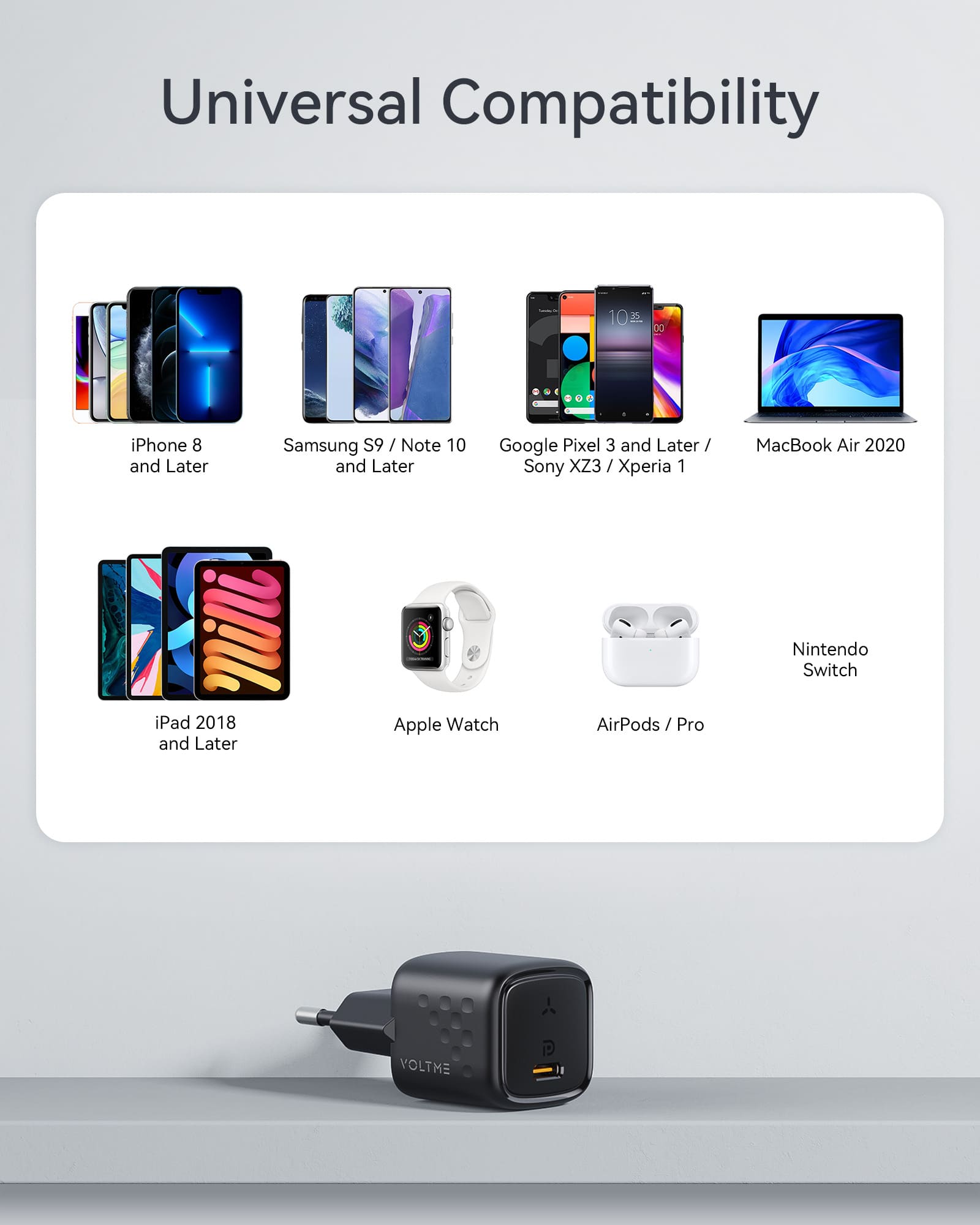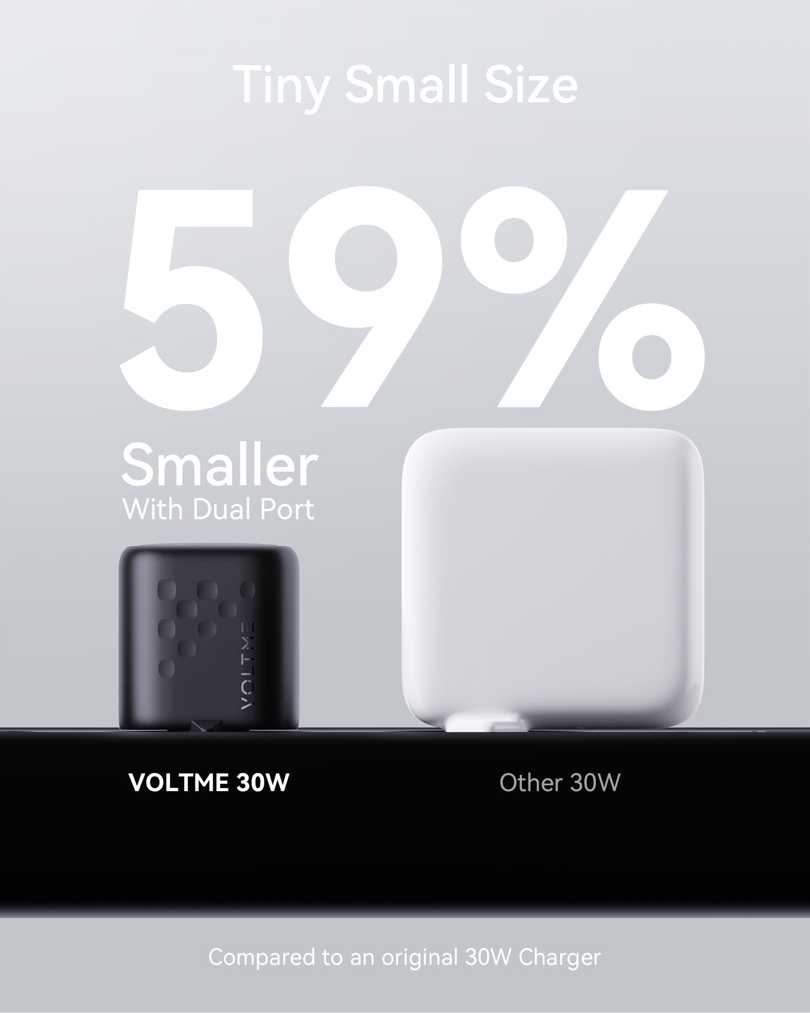 The VOLTME 30W charger is designed for portability, featuring a tiny, small size. This dual-port charger is 59% smaller than an original 30W charger, making it easy to carry.
