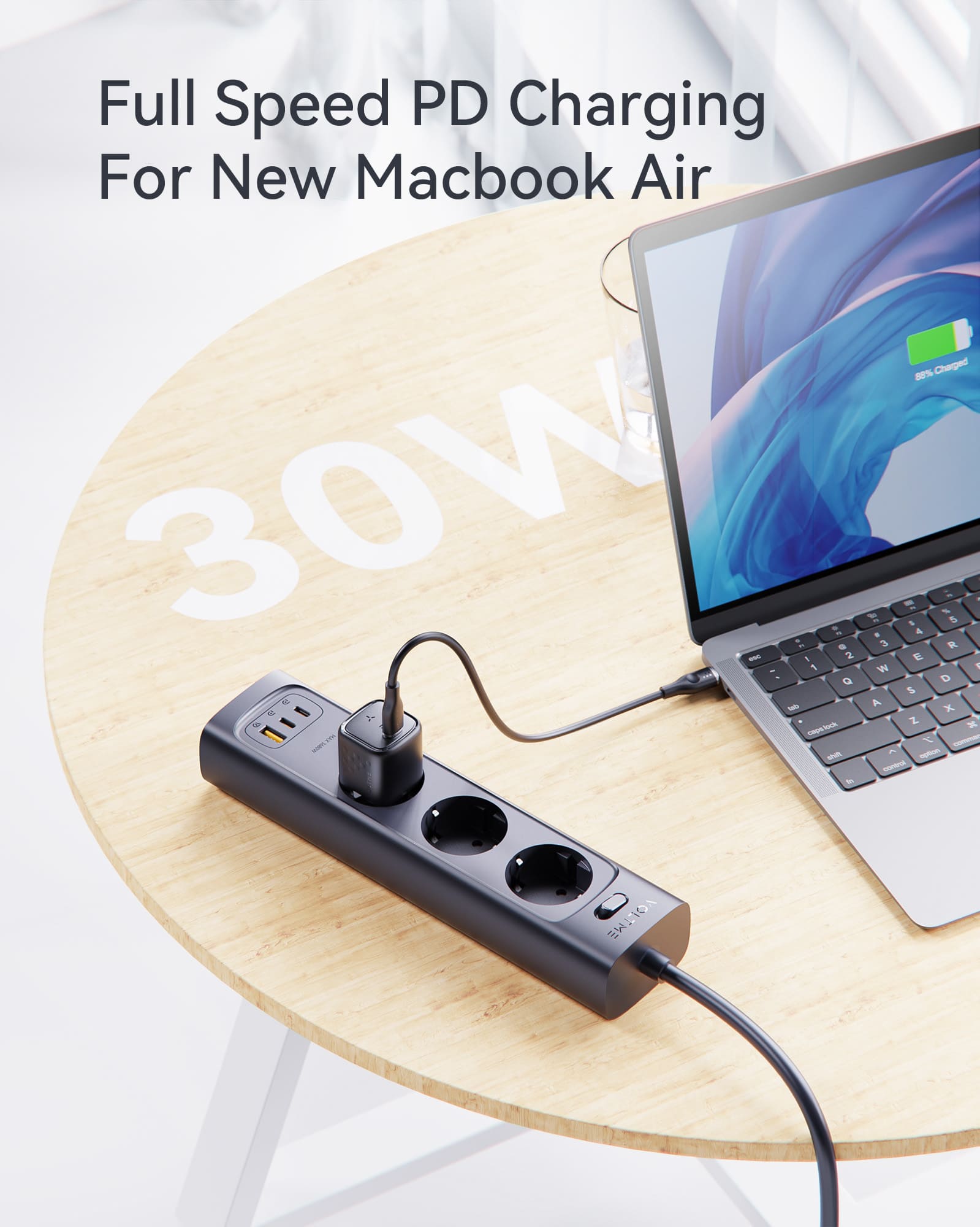 Get full-speed Power Delivery (PD) charging for your New MacBook Air with the 30W charger. Its compact size allows it to plug directly into a power strip for convenient laptop charging.