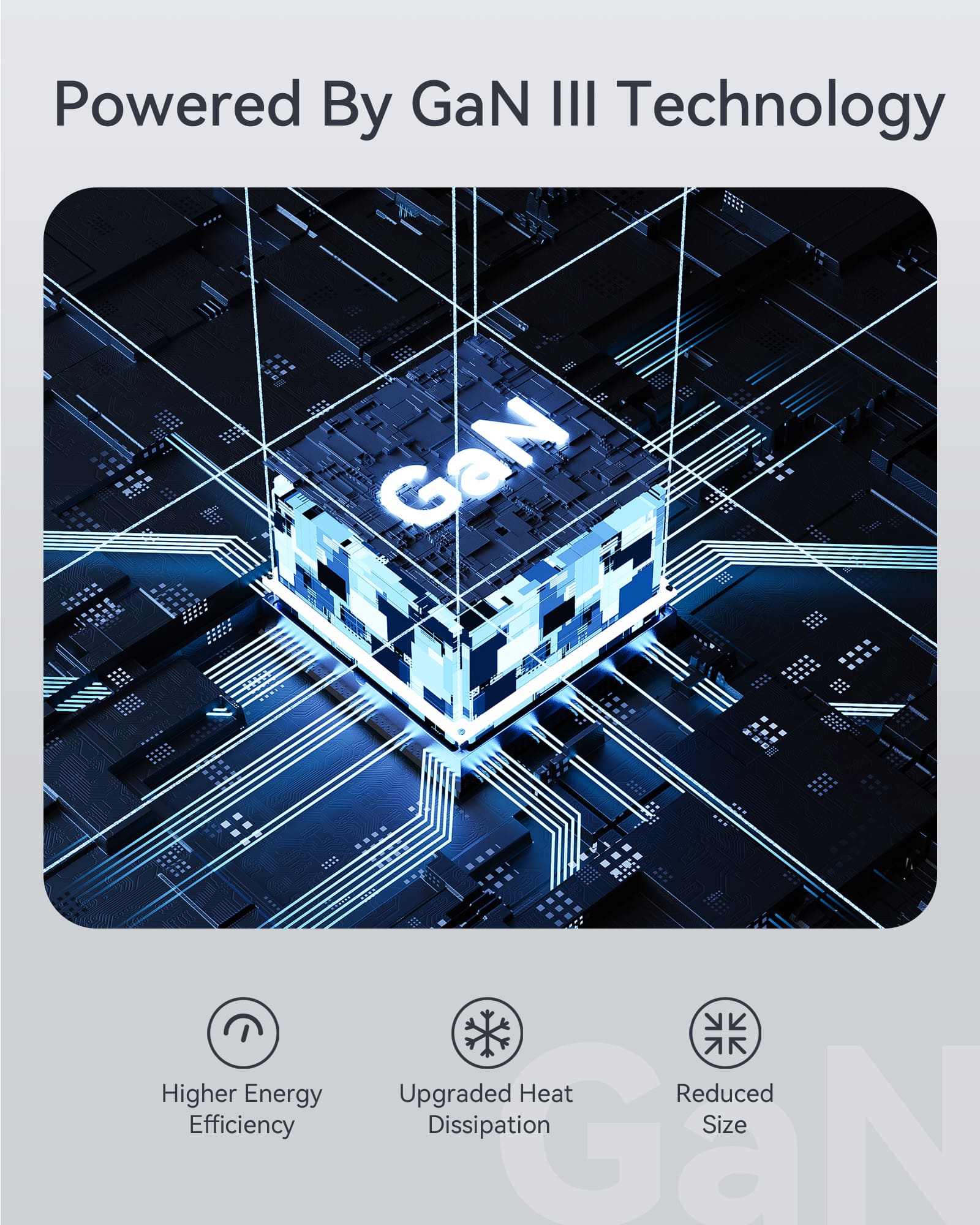 This charger is powered by GaN III Technology, which provides several benefits. It offers higher energy efficiency, upgraded heat dissipation, and a reduced size for a superior charging experience.