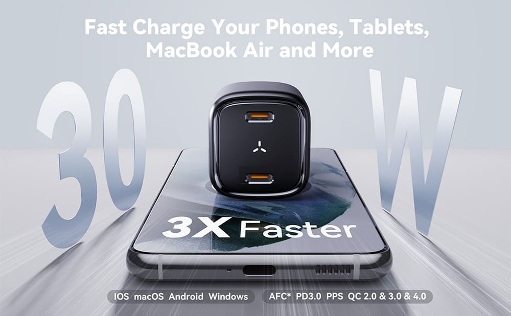 3X faster than conventional wall chargers; you can charge iPhone 13 from 0% to 50% in 30 mins, and charge your Samsung phones at full speed. The USB C charger block supports PPS and Power Delivery 3.0.