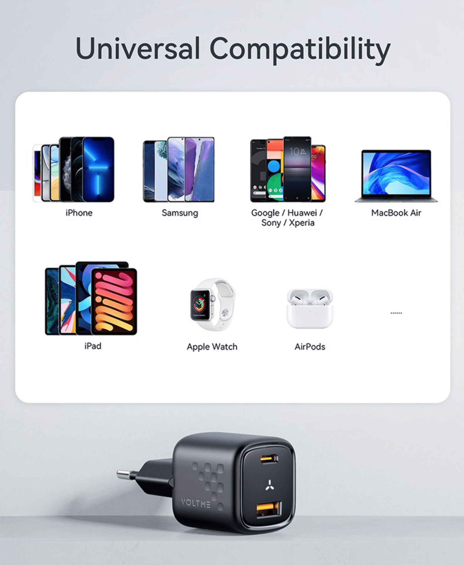 Lifetime of VOLTME power block 30W is more than 30,000 hours. Supports charging of Macbook Air, tablets, phones, and other devices with over-voltage, overheating, and short-circuit protection to keep connected devices safe.