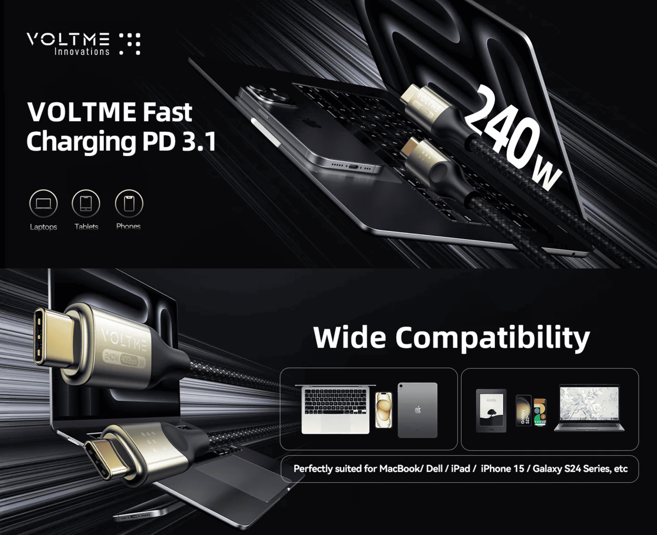 The VOLTME Powerlink Utron USB-C Charging Cable delivers up to 240W of fast charging for phones, tablets, and laptops, with a 40Gbps data transfer rate. It supports 8K@60Hz video output and is Thunderbolt 3 compatible. Built with durable double-braided nylon and a 24K anodized connector, it resists wear and corrosion while providing reliable performance for charging, data transfer, and high-definition streaming.