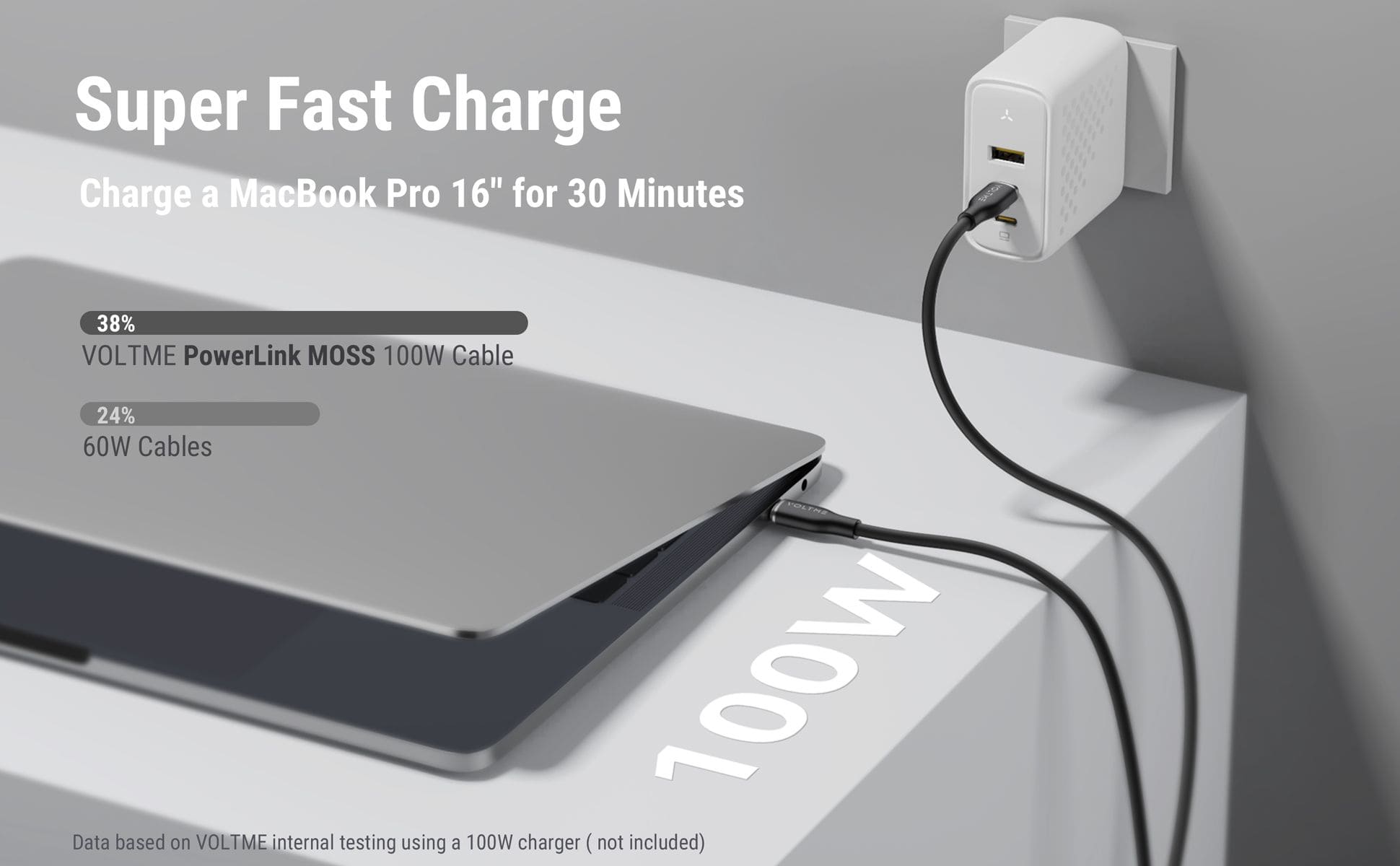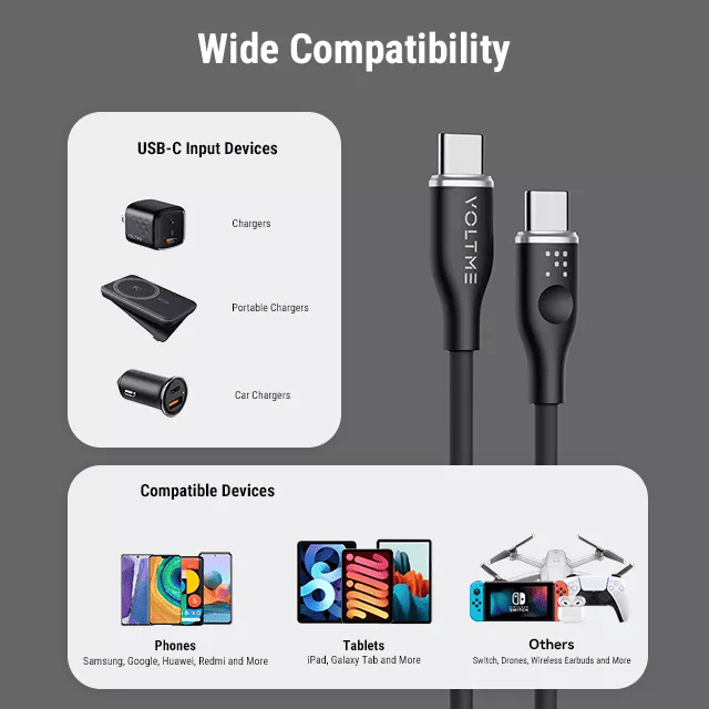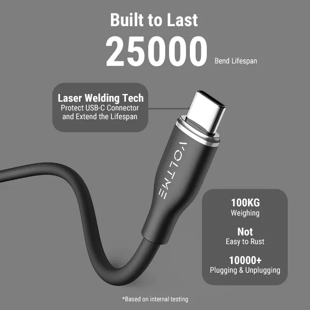 VOLTME 60W Type C Cable is made of high-strength silicon to withstand up to 25,000 bends and a maximum weight of 100KG. Remains Tangle-free even when stuffed into a handbag, computer bag, pocket, or wrapped around a portable charger. This is a light and powerful charger for your everyday use.