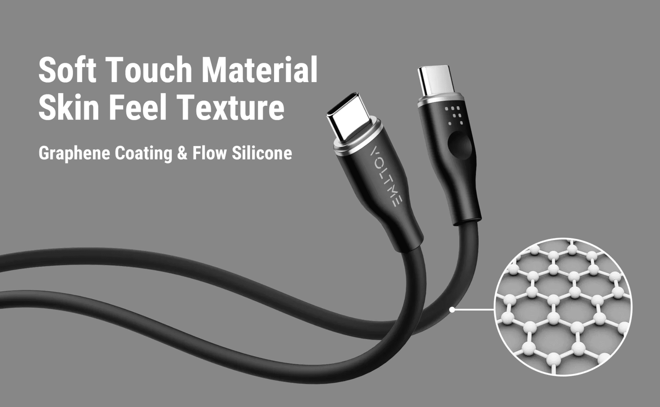 VOLTME 60W USB C to USB C PD Charging Cable is made of liquid silicone, a more green material with a super soft touch skin-feeling texture. This cord is covered with Graphene Coating, which makes it more flexible, lighter, stronger, and dissipate heat better.