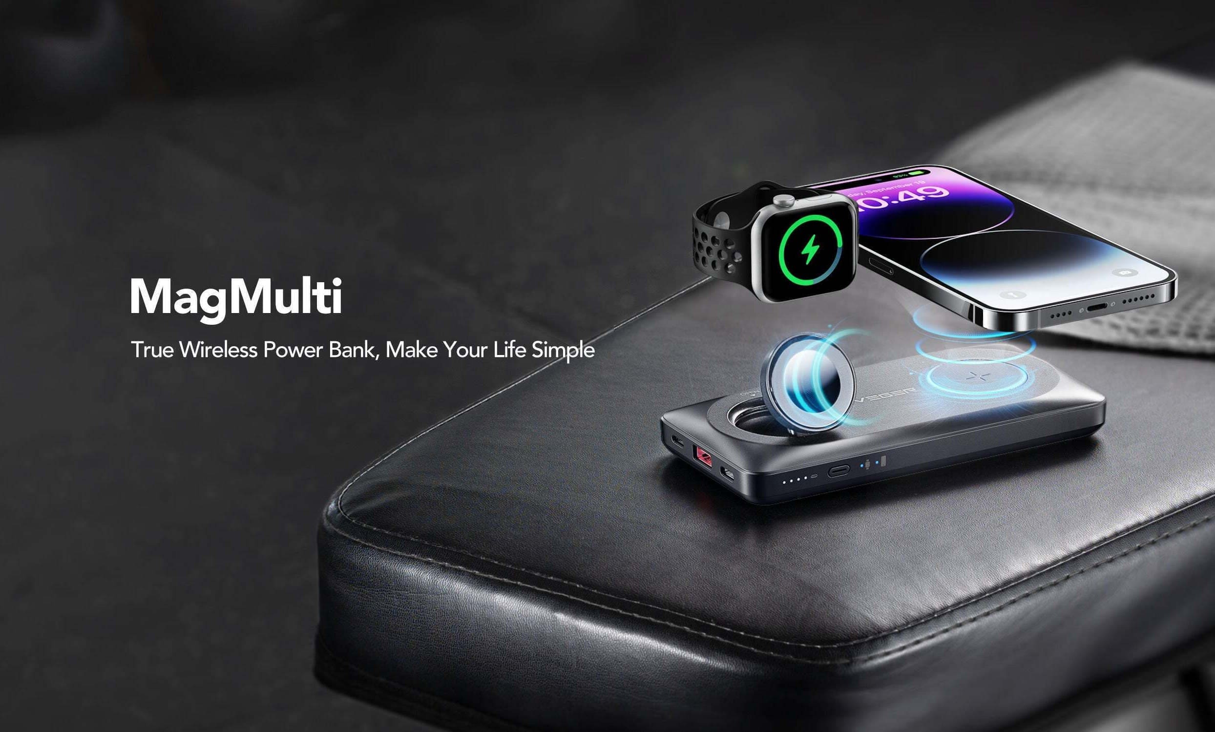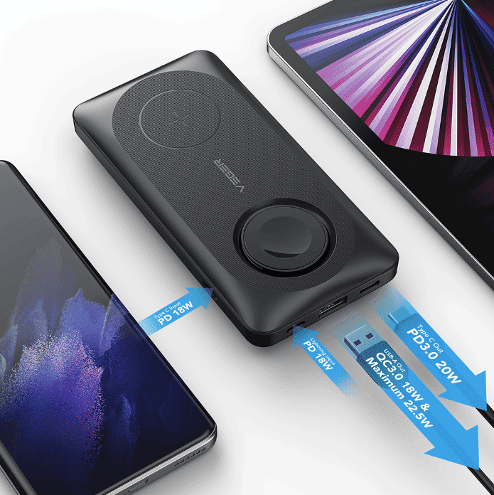 You can recharge the power bank with the 18W PD Lightning input port, the Type-C input port, and the Type-C input/output port that supports PPS, PD/QC3.0, while the USB-a QC 3.0 output port and the Type-C input/output port can provide your phones or tablet with a powerful charge in a short period of time. The wireless output for phones and AirPods supports 5W, 7.5W (for iPhone), 10W, and 15W Max wireless fast charging. The iWatch output features 2.5W.