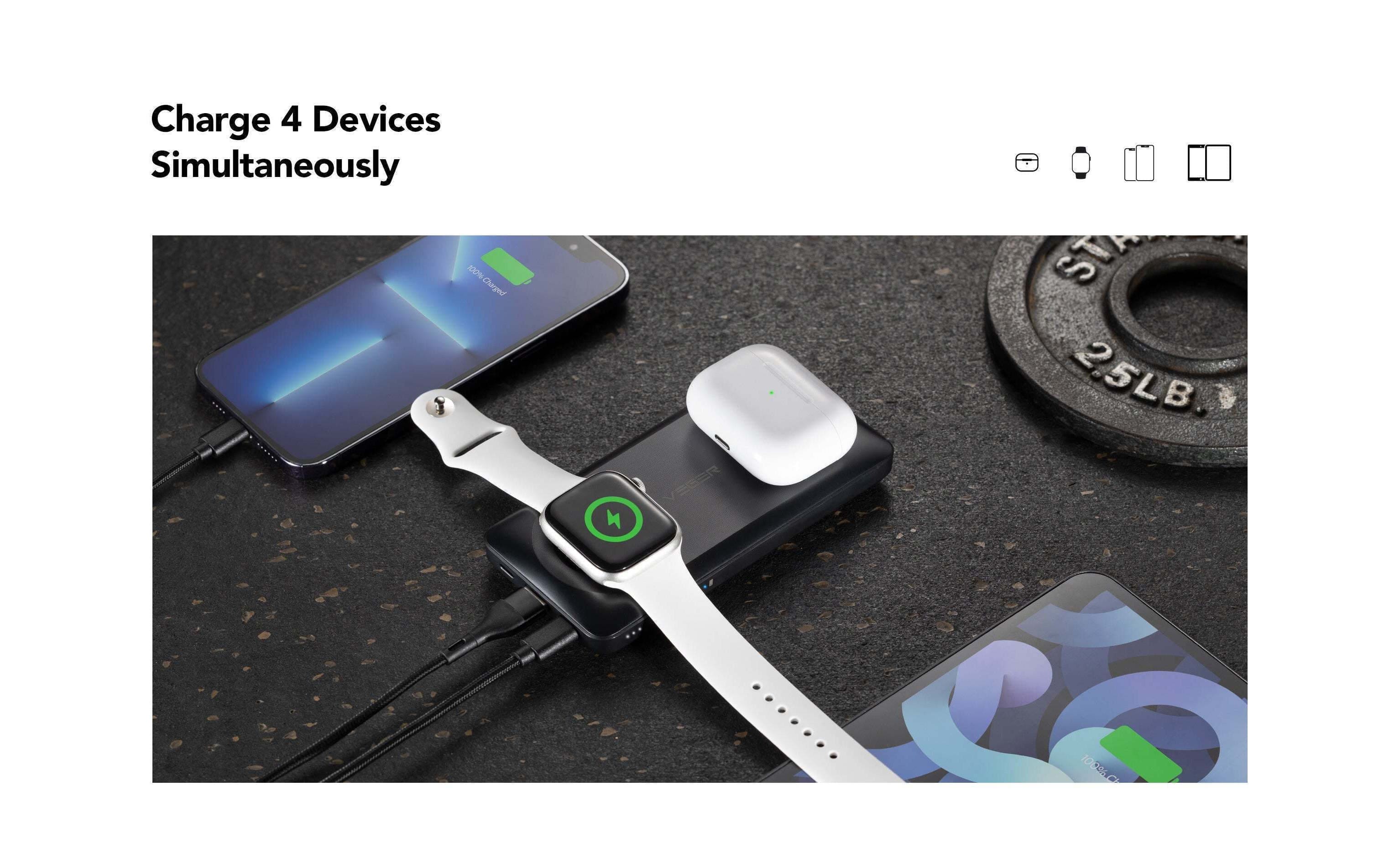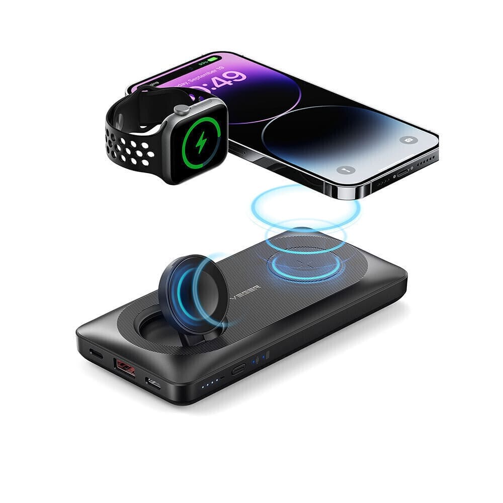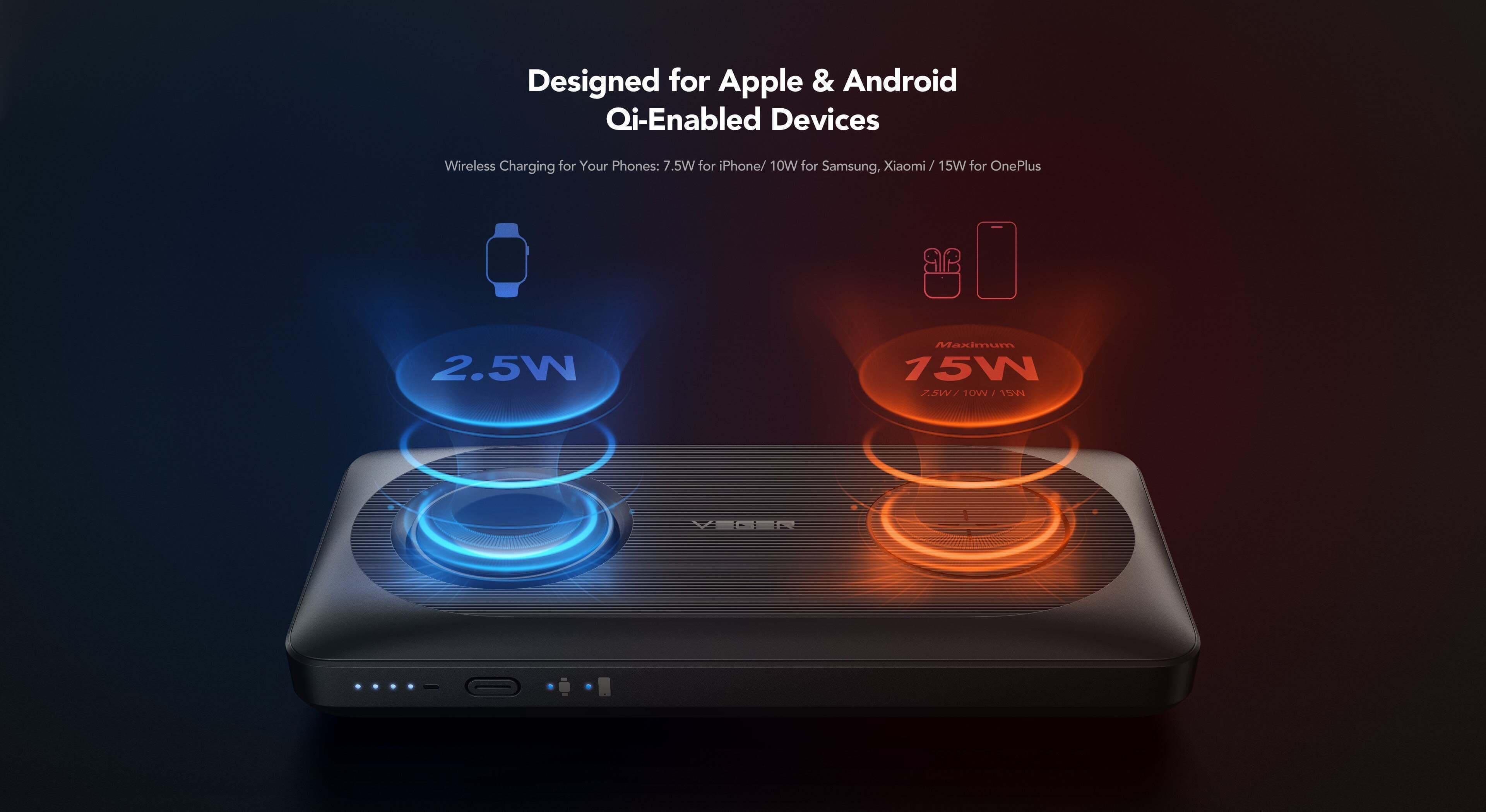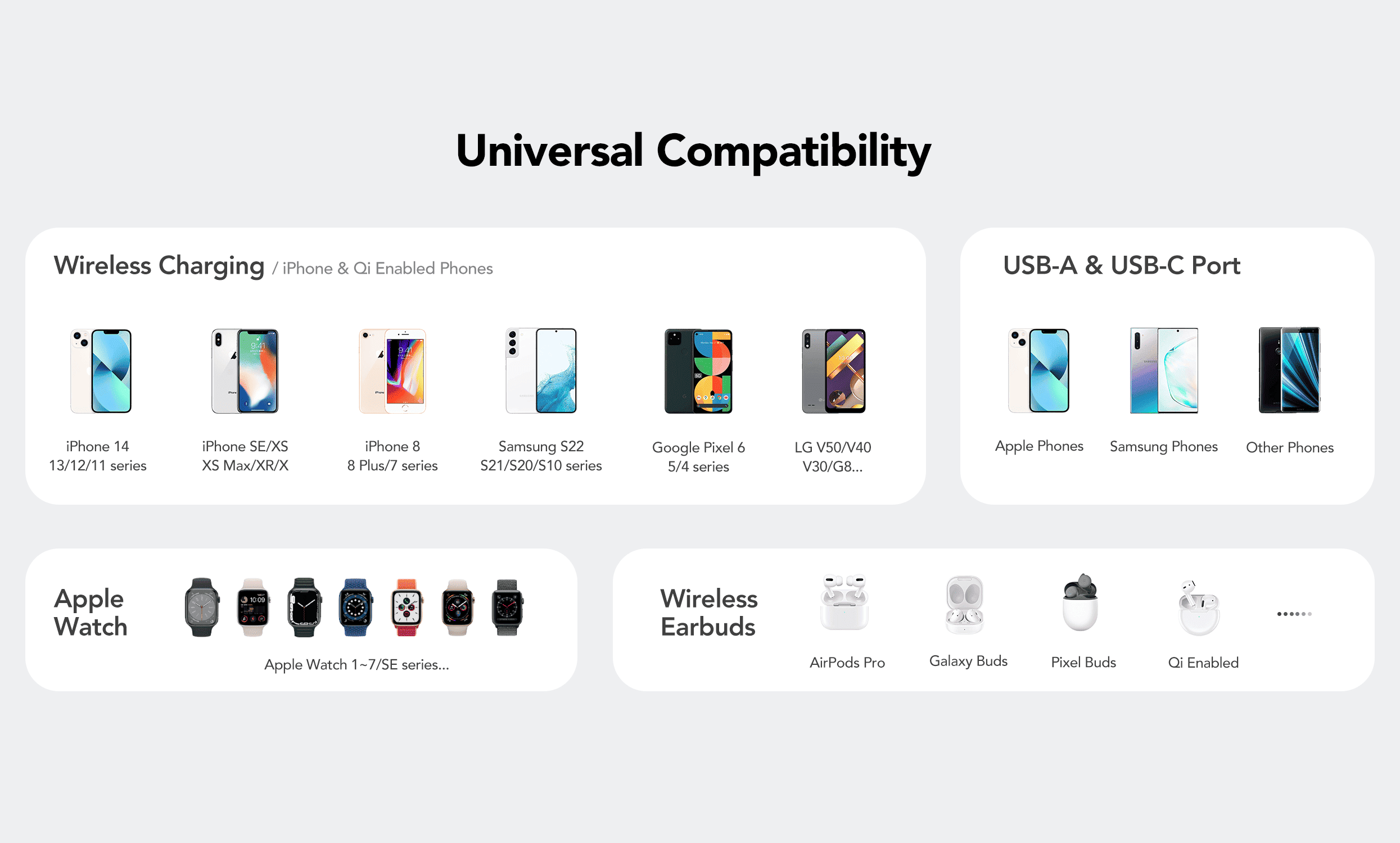 Wireless charging compatible with: Apple Watch SE/7/6/5/4/3/2, AirPods Pro 2/Pro/3/2, iPhone 14/14Plus/14Pro/14ProMax/13 Mini/13/13 Pro/13 Pro Max/12 Mini/12/12 Pro/12 Pro Max/iPhone 11/X/8 and other Qi-enabled devices. It is also compatible with most devices on the market, such as Smartwatches, Smartphones, when using the Type-C or USB-A outputs of the PowerBank.