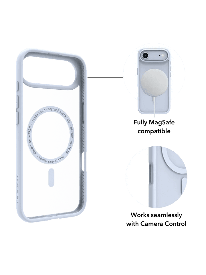 The Grenen MagSafe bumper case is a stylish accessory for your phone made from 100% recycled and recyclable plastic materials. It offers robust protection with 2m (6.5 ft) impact protection and features raised edges that safeguard both the camera and screen from potential damage. The clear back design allows you to showcase your phone's original color, while the bumper can be color-matched for a coordinated look.